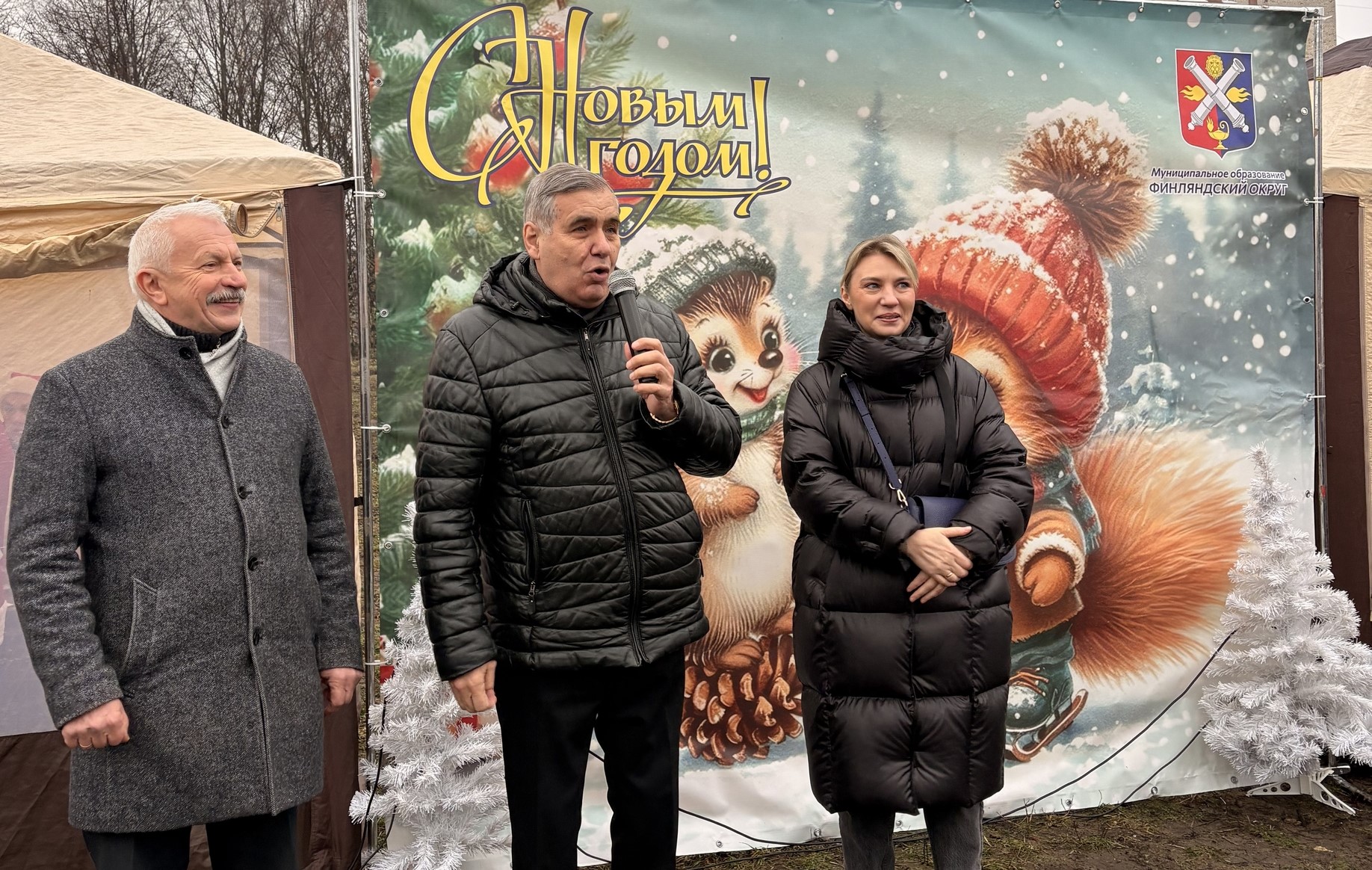 Ровно в полдень прозвучали новогодние фанфары, и на площадку вышли Снегурочка с помощниками Морозиками. Новогодняя волшебница объявила о начале гуляний и предоставила слово главе Финляндского округа Игорю Кудинову. Он поздравил всех собравшихся с наступающим Новым годом и пожелал здоровья, мира, добра и счастья.