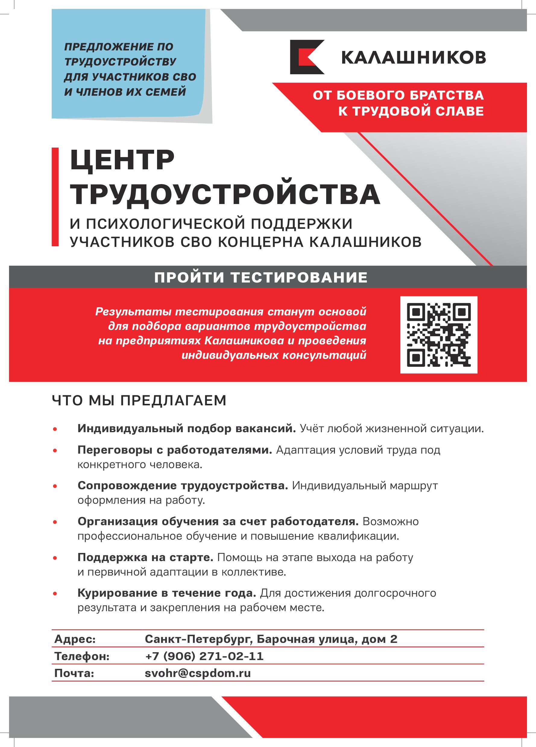 Центр трудоустройства и психологической поддержки Концерна Калашников приглашает участников СВО и членов их семей для прохождения онлайн-тестирования (http://www.cspdom.ru/ofer.php), подбора вакансий и трудоустройства. При необходимости возможно обучение (повышение квалификации, получение рабочей специальности и т.д.) за счет работодателя, а также психологическая поддержка каждому обратившемуся.