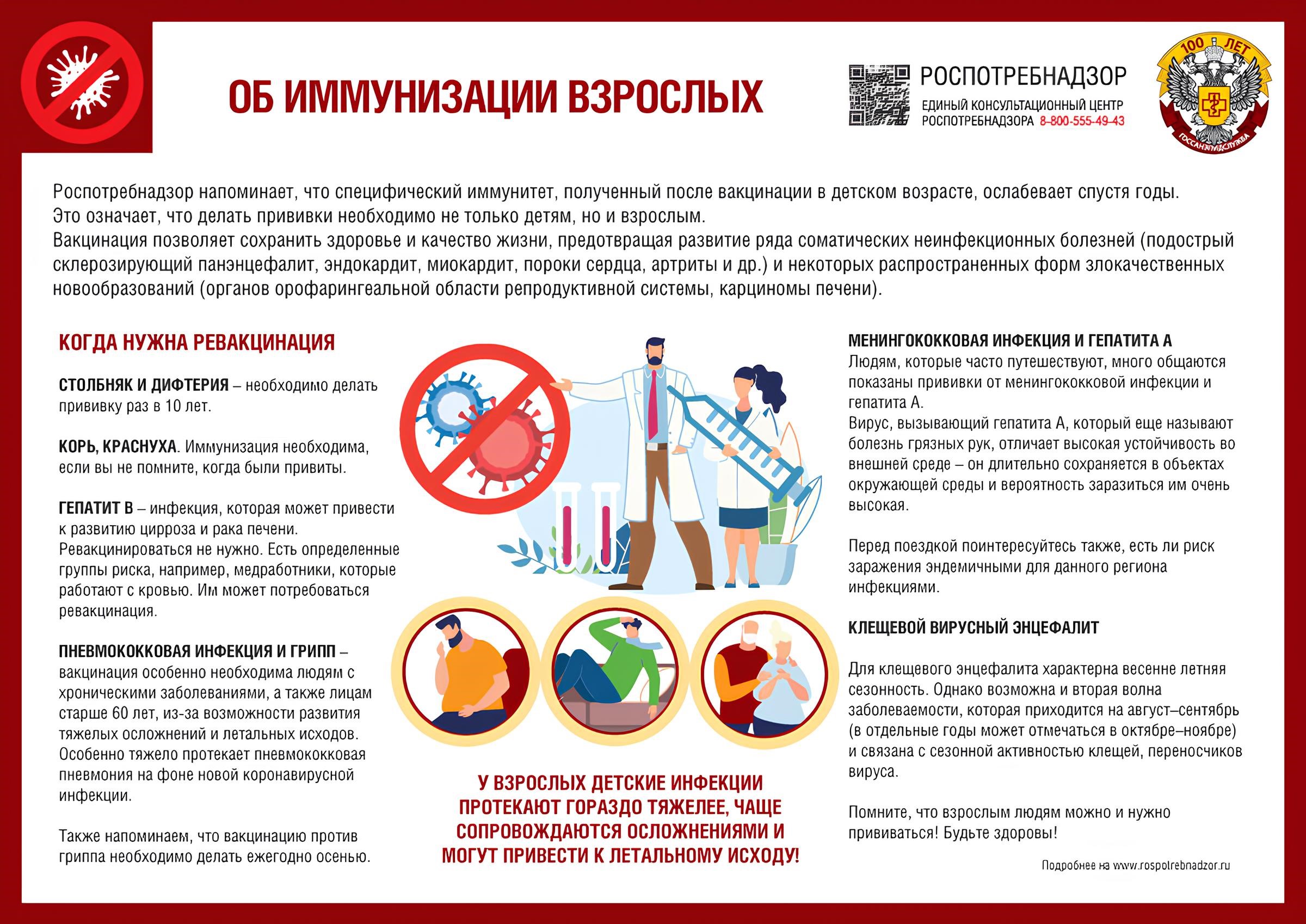 Роспотребнадзор напоминает, что специфический иммунитет, полученный после вакцинации в детском возрасте, ослабевает спустя годы. Это означает, что делать прививки необходимо не только детям, но и взрослым.