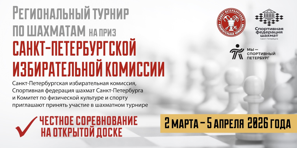 Санкт-Петербургской избирательной комиссии информирует о проведении регионального турнира по шахматам. В категории «Командное первенство» турнир пройдет среди команд высших учебных заведений Санкт-Петербурга и Ленинградской области в возрастной группе «юниоры, юниорки (18 – 25 лет)». Турнир состоится 2 апреля 2026 года в Музейно-выставочном центре «Россия – Моя история» (Санкт-Петербург, ул. Бассейная, д. 32). В категории «Личное первенство» могут принять участие граждане Российской Федерации, проживающие на территории Санкт-Петербурга, достигшие 18-летнего возраста.