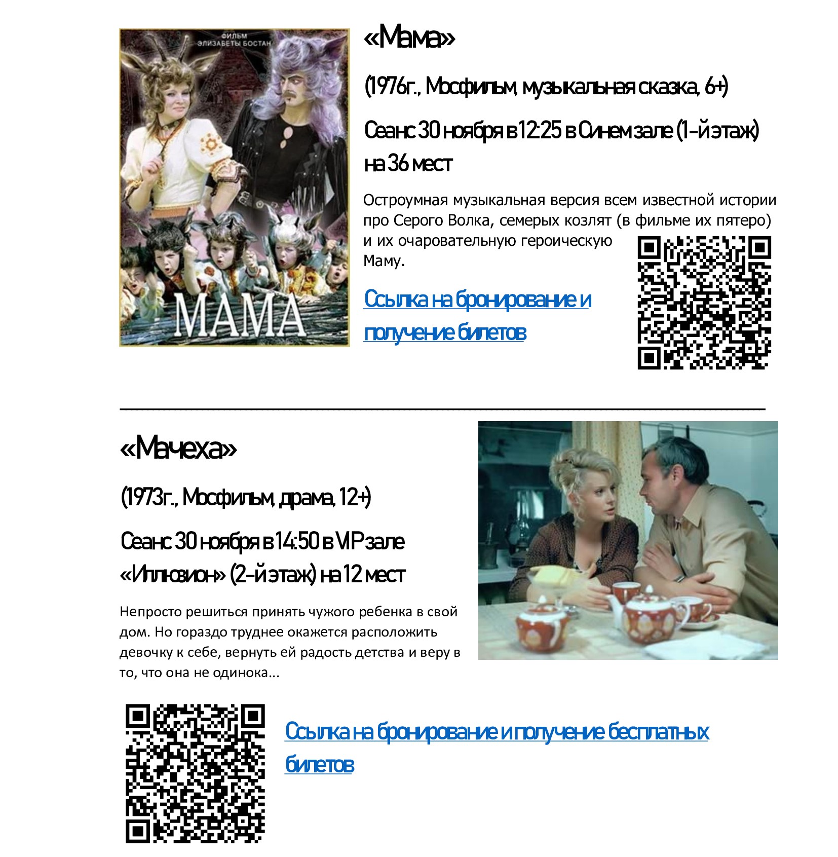 30 ноября отмечается знаменательная дата — День матери. Кинотеатр «Фильмофонд» совместно с Комитетом по культуре Санкт-Петербурга приглашает зрителей на бесплатные сеансы, посвящённые этому событию. Бесплатные билеты уже доступны на сайте и в кассе кинотеатра.