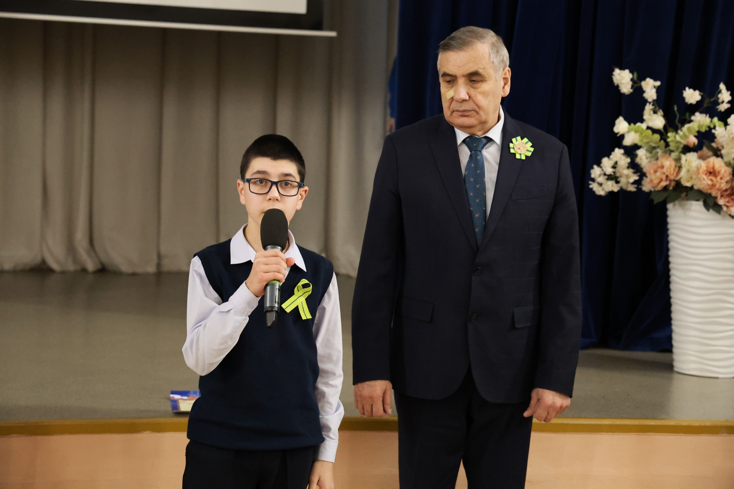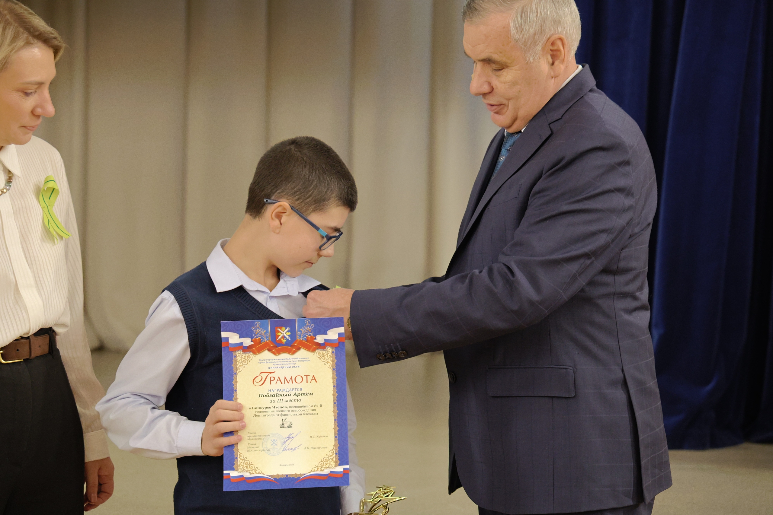 Перед церемонией награждения главы обратились к участникам с тёплыми словами. Они подчеркнули, как важно знать и бережно хранить историческую память, а также поблагодарили юных чтецов и их родителей за активное участие в конкурсе. Затем присутствующим показали видеоролик с лучшими отрывками выступлений победителей и призёров. Из 228 заявленных участников победителями стали 27 человек. Но особого внимания на церемонии заслужило живое исполнение Артёмом Подгайным стихотворения Ольги Берггольц «Я говорю с тобой под свист снарядов». Преодолев волнение, мальчик блестяще прочёл произведение наизусть. Его выступление глубоко тронуло главу округа, и он вручил Артёму памятный подарок — значок с блокадной ленточкой, который снял с лацкана своего пиджака.