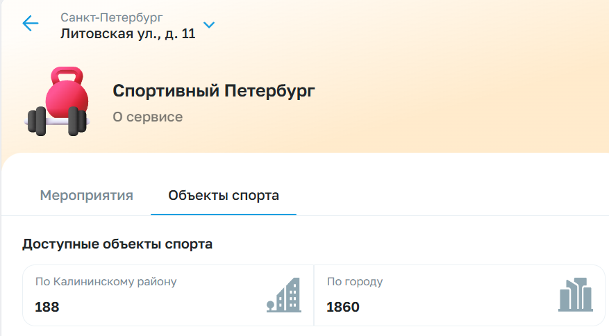 Обновлённый «Спортивный Петербург» предлагает жителям и гостям города наиболее полную и актуальную информацию о возможностях для занятия спортом и физкультурой. Цифровой сервис покажет подходящие площадки, спорткомплексы и мероприятия поблизости от дома в соответствии с индивидуальными потребностями и предпочтениями. Для этого необходимо указать адрес в разделе «Профиль» и задать нужные значения в поисковом фильтре.